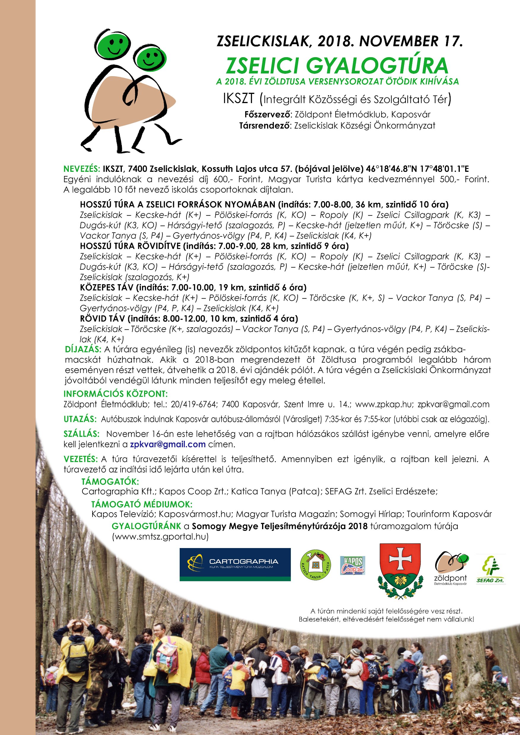 Zselickislak Községi Önkormányzat a környezet tudatos életmód népszerűsítése és szűk lakókörnyezetük szebbé tétele érdekében a Zselici Gyalogtúra napján ÖKO-TÚRÁT tart. A 11.00 órakor induló, 5 km hosszú gyalogtúra útvonalán szelektív hulladékgyűjtést szerveznek, melyhez az eszközöket (zsák és védőkesztyű) biztosítják a résztvevőknek. Az ÖKO-TÚRA programon térítésmentes a részvétel.
